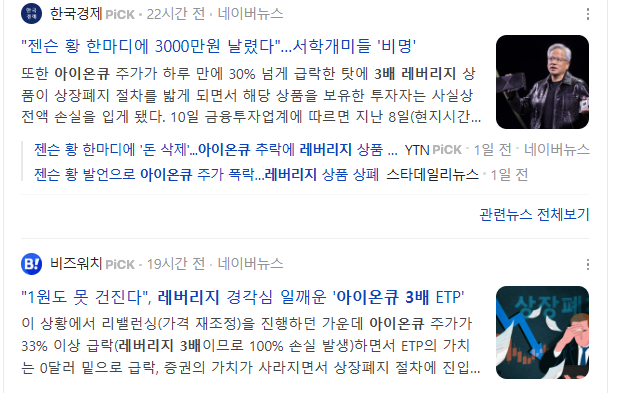 아이온큐의 주가가 이미 많이 상승했고 이미 탑승한 투자자들을 따라잡기 위해서 선택한 3배 레버리지 ETF LEVERAGE SHARES 3X LONG IONQ ETF SECURIT 는 -50% 하락한 날 3배의 하락률 -150%를 기록했기에 하루만에 상폐가 되어 해당 상품에 투자한 투자자들 전부가 투자 원금 전부를 날려야 했습니다.