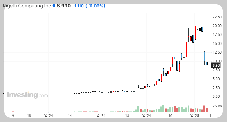 미국시장에서 양자컴퓨터 테마 대장주로 분류되는 아이온큐, 리게팅컴퓨팅 주가만 봐도 하루만에 -40~-50% 주가 급락이 나왔습니다. 미국은 한국과 다르게 상한가, 하한가로 주가 변동폭을 제한하지 않고 있기 때문에 하루만에 주가가 몇 배 상승할 수도 있고 상장폐지까지 이어질 수도 있습니다.