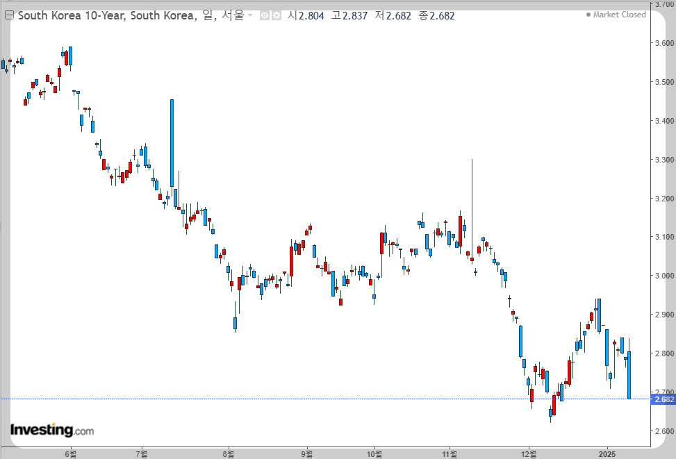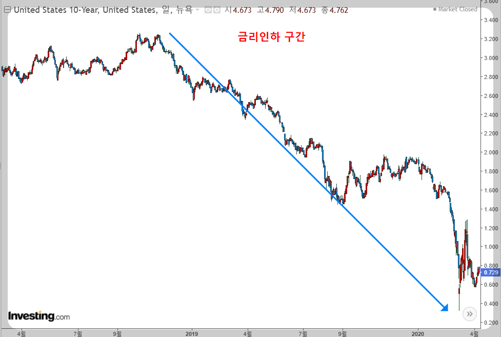 한국의 국채금리는 기준금리 인하를 반영해서 서서히 하락하고 있는 추세입니다. 문제는 지금 미국 국채금리와 격차가 2% 이상 발생하고 있다는 것이죠.