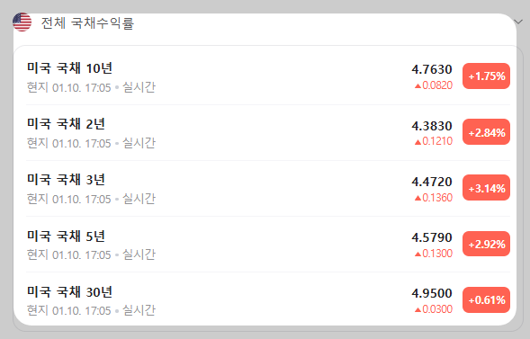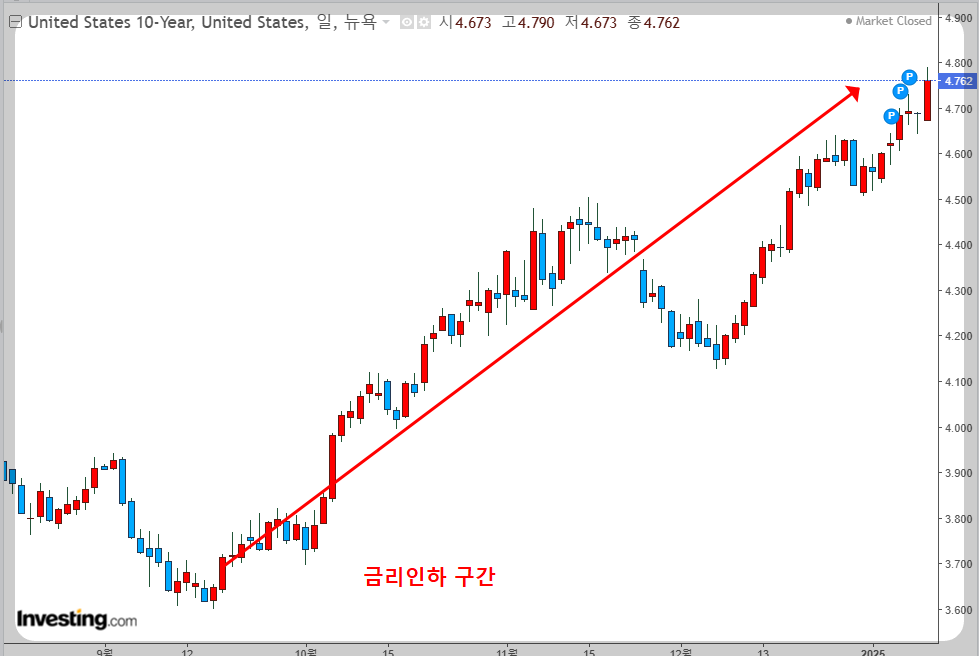 그런데 이번 금리 인하 사이클에서는 전혀 다른 결과가 나오고 있습니다. 미 연준이 금리인하를 선언했음에도 불구하고 미국 10년물 국채 금리가 강하게 반등이 나오고 있습니다. 금리인하 시기임에도 불구하고 최대안전 자산인 미국 국채에만 투자해도 연간 5%에 가까운 수익률을 기록할 수 있다는 이상한 현상이 발생하고 있는 것입니다.