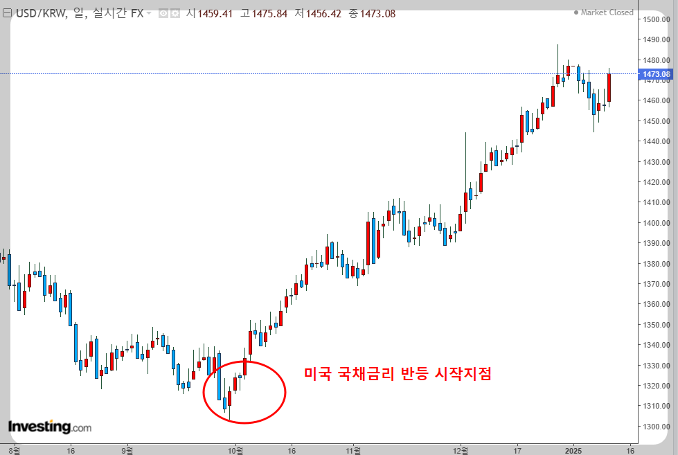 환율은 미국국채 금리가 강한 반등을 시작한 시점부터 폭발적인 상승을 시작했다는 것을 확인하실 수 있습니다.