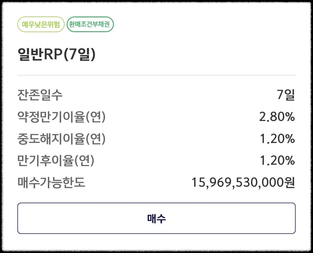 RP란 금융기관이 일정 기간이 지난 후 확정금리를 보태 되사는 조건으로 발행하는 채권을 말합니다. 따라서 금융기관이 망하지 않는다면 사실상 원금보장이 되는 상품이라고 생각하시면 됩니다.