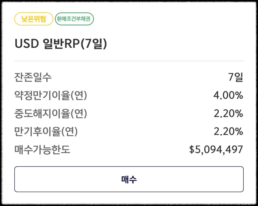 게다가 달러는 파킹이 가능한 수시 RP도 제공하고 있습니다. 따로 만기가 없이 매일 연 3.8%의 이자를 지급하는 것이죠. 원화의 경우 증권사마다 조금씩 다르겠지만 키움증권은 원화로 수시 RP는 제공하고 있지 않았습니다.