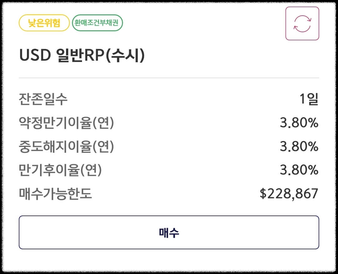 게다가 달러는 파킹이 가능한 수시 RP도 제공하고 있습니다. 따로 만기가 없이 매일 연 3.8%의 이자를 지급하는 것이죠. 원화의 경우 증권사마다 조금씩 다르겠지만 키움증권은 원화로 수시 RP는 제공하고 있지 않았습니다.