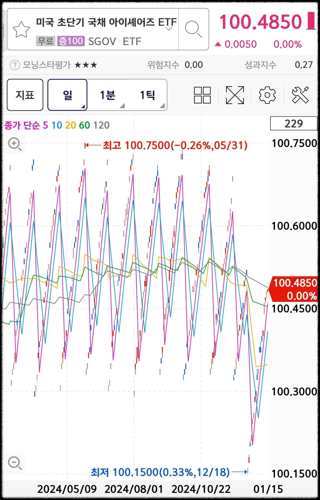 해당 ETF의 주가는 배당을 받기전에 매도하는 투자자들을 위해 보유기간에 따른 이자를 지급하기 위해 가격을 인위적으로 변동시키고 있습니다. 배당을 받은 경우 배당락이 발생하고 다시 보유기간에 따라 주가가 승상하는 것을 반복하게 됩니다. 즉, 이자는 매 월 받게 되지만 이자를 받지 못해도 매매 차익금으로 이자를 지급하기 때문에 달러 파킹통장으로서의 역할을 훌륭히 수행할 수 있습니다.