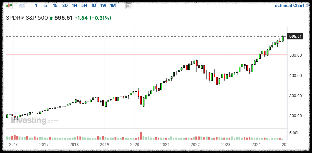 VOO, SPY, IVV 모두 동일하게 애플, 엔비디아 등 기술주를 포함해 월마트, 제이피모간 등 우량한 기업들을 모아놓은 S&P500을 추종하는 ETF입니다. 최근 기술주들의 시가총액이 빠르게 증가하면서 S&P500에서 기술주들의 비중이 꽤 높아진 상황이긴 하지만 다양한 섹터의 기업들이 모여있는만큼 변동성은 작고 안정성은 높은 지수입니다. 축구 포메이션으로 비유하자면 미드필더쯤 되겠네요. 해당 상품은 20년간 약 600% 상승했습니다.