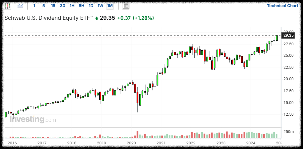 브로드컴, 코카콜라, 펩시 등 배당성향이 높은 기업들을 모아놓은 ETF입니다. SCHD에 포함된 대부분의 종목이 3~4.5% 수준의 시가 배당률을 유지하고 있으며 SCHD도 3%대의 배당을 지급하고 있습니다. 보유 현금 대부분을 성장을 위해 사용하는 기술주들의 비중이 적고 안정적으로 이익을 창출할 수 있어 꾸준히 배당을 할 수 있는 기업들로 구성되어 있기에 주가 상승률은 위 ETF들과 비교해봤을 때 매우 더딥니다.