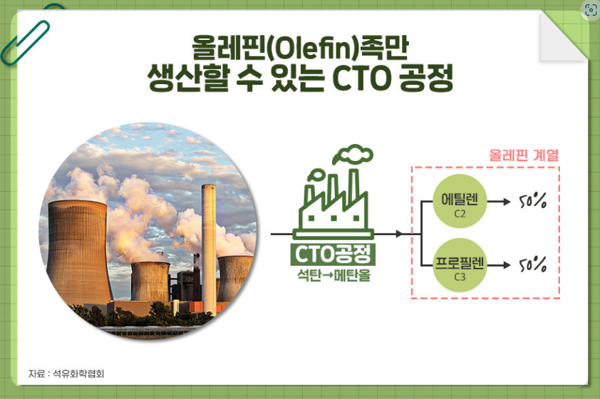 그런데 중국은 CTO 공정으로 석탄을 가스화해 합성가스를 만들어 메탄올로 전한환 후 에틸렌과 프로필렌을 생산합니다. 해당 공정은 환경을 파괴한다는 단점이 있지만 중국은 당연히 신경쓰지 않을 겁니다. CTO 공정은 생산 다양성은 떨어지지만 저렴한 석탄으로 50% 에틸렌, 50% 프로필렌을 생산할 수 있기에 생산단가 측면에서 매우 경쟁력이 높습니다.