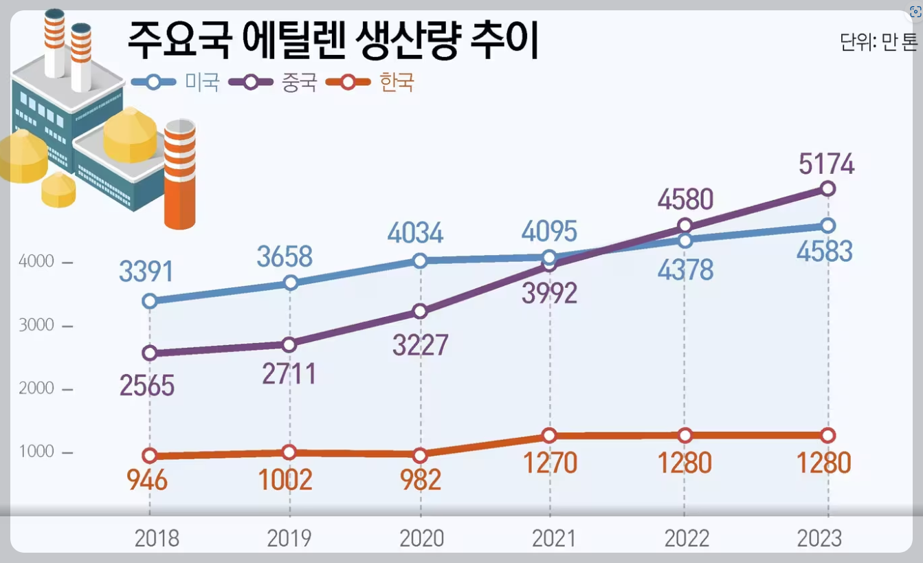 게다가 미국은 셰일가스가 남아 돌아서 어디 팔아먹을 데 없나 고민하다 불태워 없애기도 했던 국가입니다. 미국은 셰일가스를 버려 없애느니 에틸렌이라도 뽑자고 증설하고 있는 상황입니다. 단순히 에틸렌 생산단가 싸움에서는 이길 가능성이 없는 거죠.