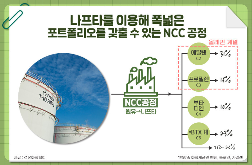 일단 미국의 석유화학제품 생산단가를 알아보기 전에 대한민국의 석유화학제품 생산공정인 NCC를 살펴보도록 하겠습니다. 대한민국은 원유를 수입해서 NCC 공정을 통해 에틸렌과 프로필렌을 각각 31%, 16%를 추출해냅니다.
