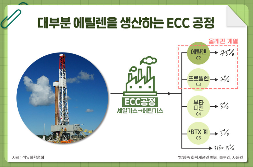 그런데 미국은 셰일가스가 뿜어져 나오는 세계 최대 산유국 중 하나이죠. 그런데 셰일가스로 에탄가스를 만드는 ECC 공정을 도입하면 에틸렌이 무려 75%가 나오게 됩니다. 물론, ECC공정은 에틸렌 외 다른 기초석유화학제품은 거의 나오지 않기에 다양성은 떨어지지만 가장 핵심 제품인 에틸렌의 생산단가 측면에서는 매우 유리할 수 밖에 없습니다.