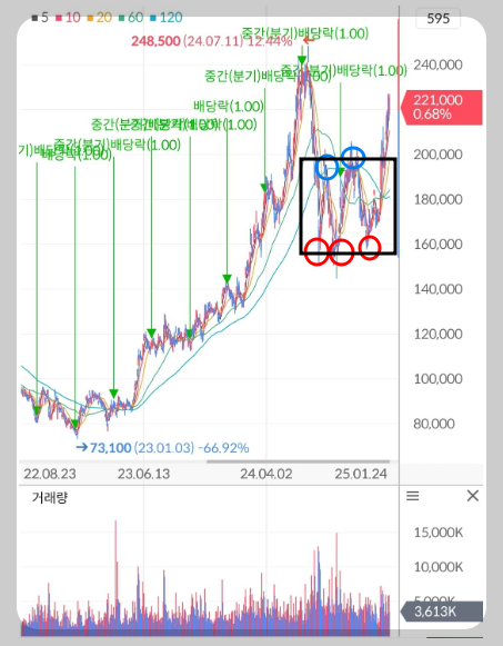 SK하이닉스의 주가는 코스피 폭락과 함께 큰 조정을 받았지만 결국 지지해주었던 16만원선을 강하게 지켜내며 주가 하락을 허락하지 않았고 하락 이후 반등하지 못하게 저항했던 20만원선을 세 번째 시도만에 결국 뚫어내며 강한 주가 상승 흐름이 나오고 있습니다. 주가 조정이 나오고 다시 상승하는 패턴이 나와준다면 18~20만원선까지 눌릴 수 있으며 해당 가격대에서는 매수를 트라이할 수 있습니다.